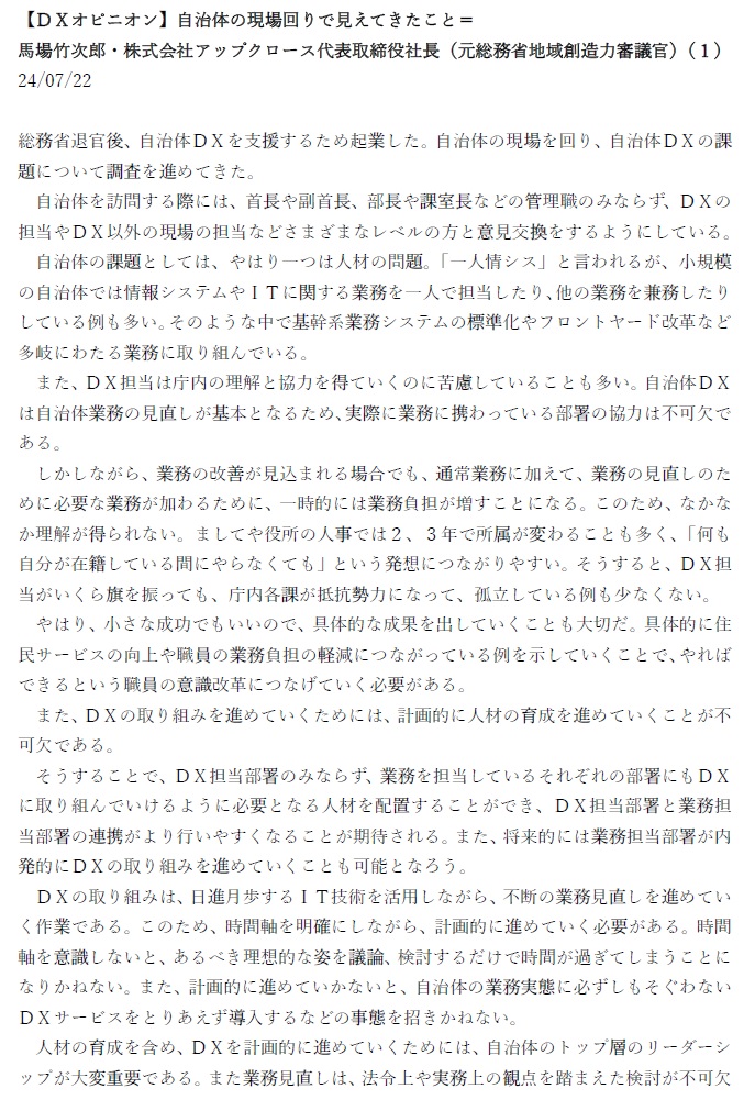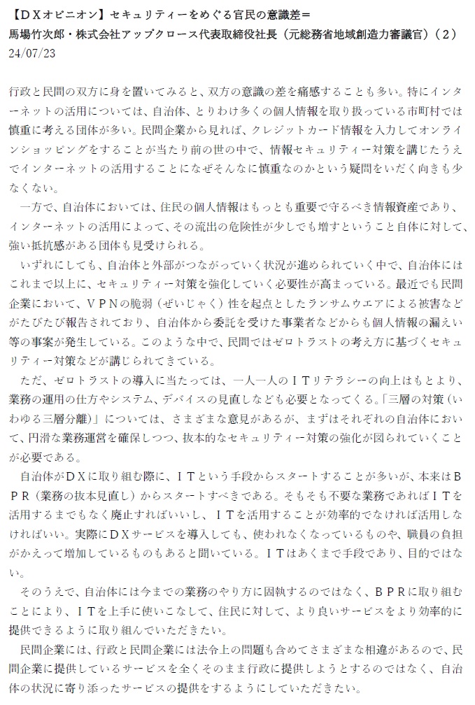 HOME > お知らせ > お知らせ 時事通信社の行政メディア「iJAMP」に寄稿しました 2024年7月23日 代表の馬場の寄稿記事が時事通信社の行政メディア「iJAMP」に掲載されました。(「ダウンロード」ボタンからPDFファイルをダウンロード可能です) 【DXオピニオン】①自治体の現場回りで見えてきたこと baba_ijump_01ダウンロード 【DXオピニオン】②セキュリティーをめぐる官民の意識差 baba_ijump_02ダウンロード Post Share LINE -お知らせ